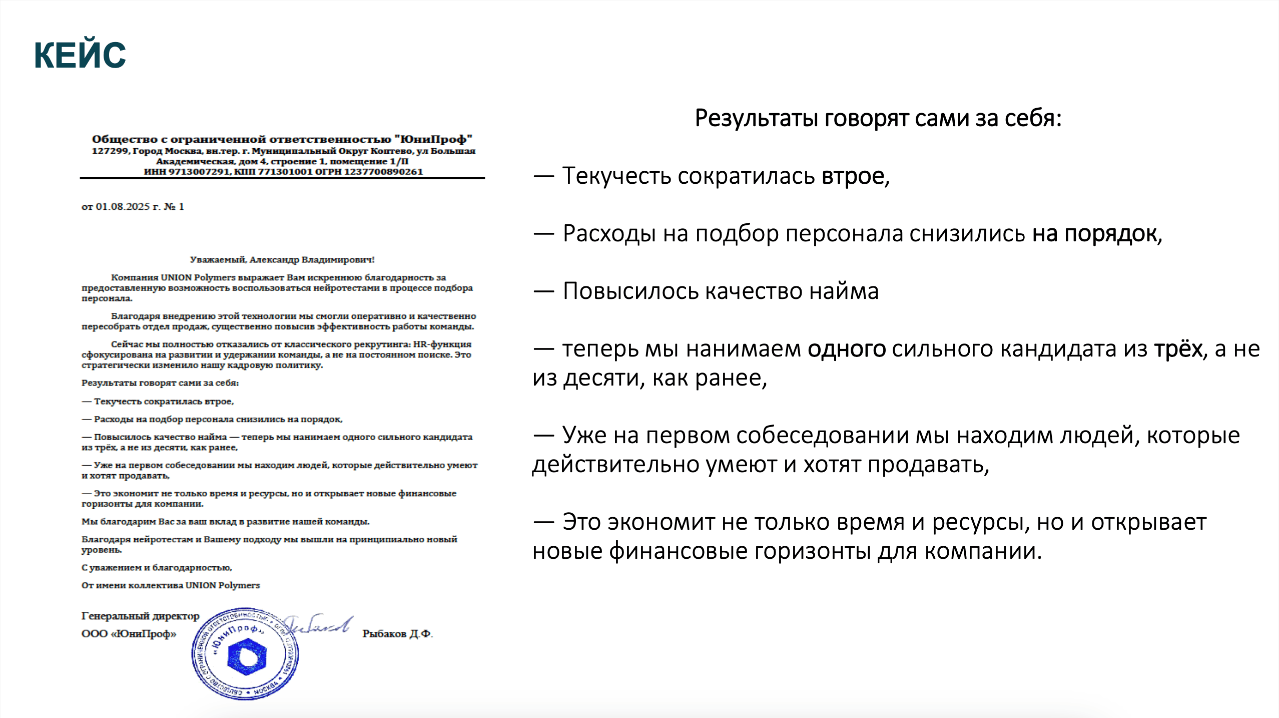 блестящее резюме, уверенное собеседование — и полное разочарование через полгода. Причина проста: традиционные методы оценки работают лишь с поверхностью, игнорируя главное — мотивацию, стрессоустойчивость и ценности человека.95% реального вклада сотрудника в бизнес определяются этими скрытыми факторами. Мы создали технологию, которая наконец-то позволяет их измерить.